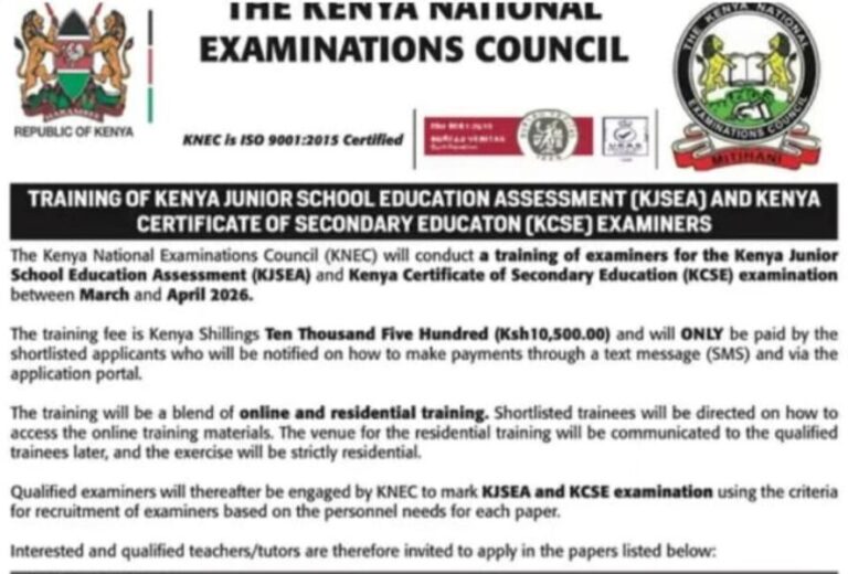 The Kenya National Examinations Council (KNEC) will conduct a training of examiners for Kenya Junior School Education Assessment (KJSEA) and Kenya Certificate of Secondary Education (KCSE) examinations between March and April 2026.